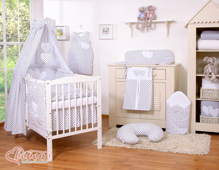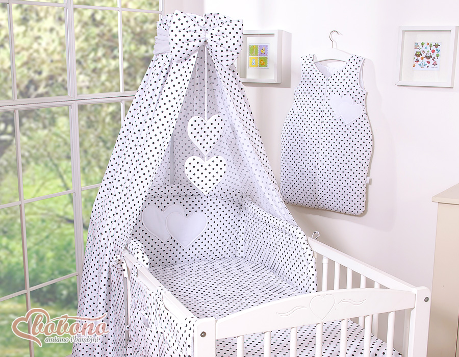 Baldachim z tkaniny- Serduszka czarne grochy na białym tle