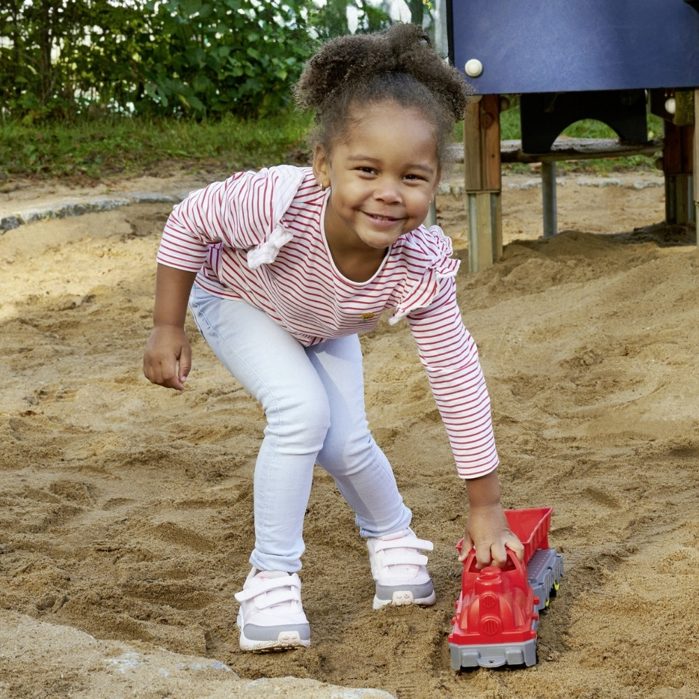- Idealny do piaskownicy – Odporność na promienie UV i łatwość czyszczenia sprawiają, że pociąg świetnie sprawdzi się również na świeżym powietrzu.