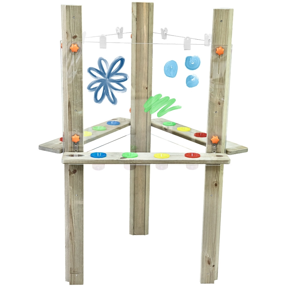 Trójstronna Sztaluga Centrum Artystyczne od marki Classic World z profesjonalnej serii EDU to innowacyjne centrum kreatywności, zaprojektowane z myślą o wspólnej zabawie. Unikalna, trójkątna konstrukcja pozwala na jednoczesną pracę trzech młodych artystów, co sprzyja integracji i nauce współpracy. Wyposażona w duże, przezroczyste powierzchnie robocze, umożliwia malowanie farbami bezpośrednio na akrylu (tworząc witraże) lub tradycyjne rysowanie na papierze dzięki solidnym klipsom. Produkt wykonano z wysokiej jakości impregnowanego drewna sosnowego, co czyni go idealnym rozwiązaniem zarówno do sal przedszkolnych, jak i na plac zabaw czy do ogrodu.