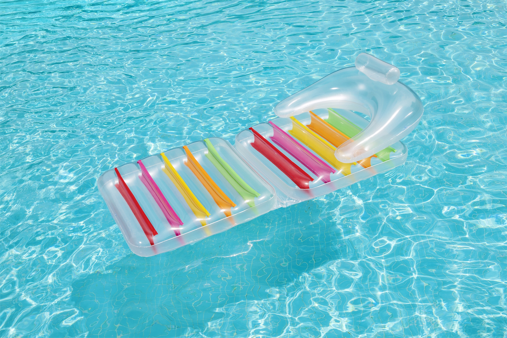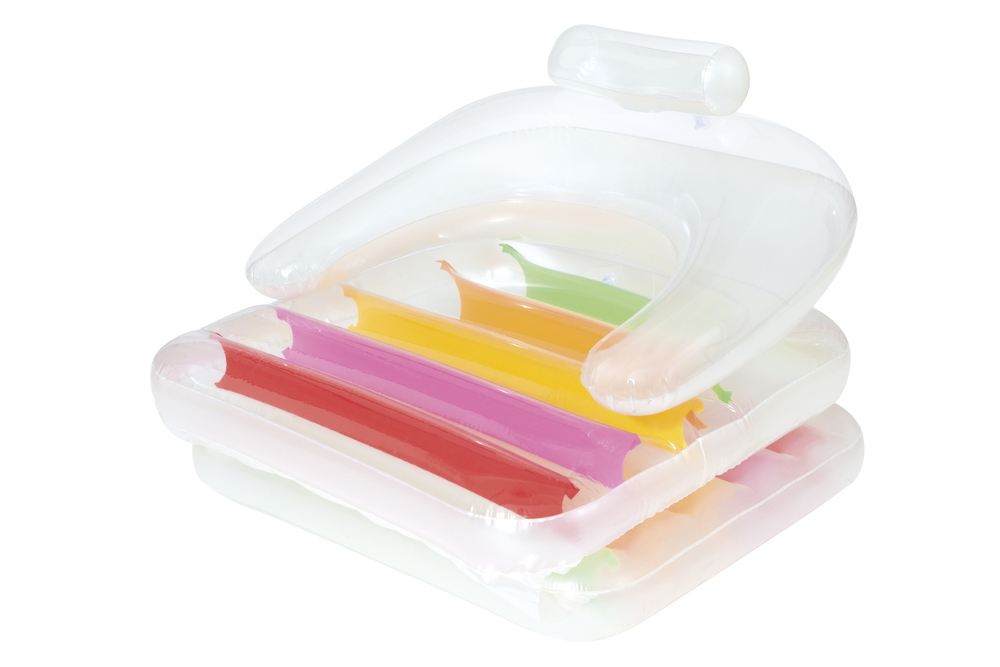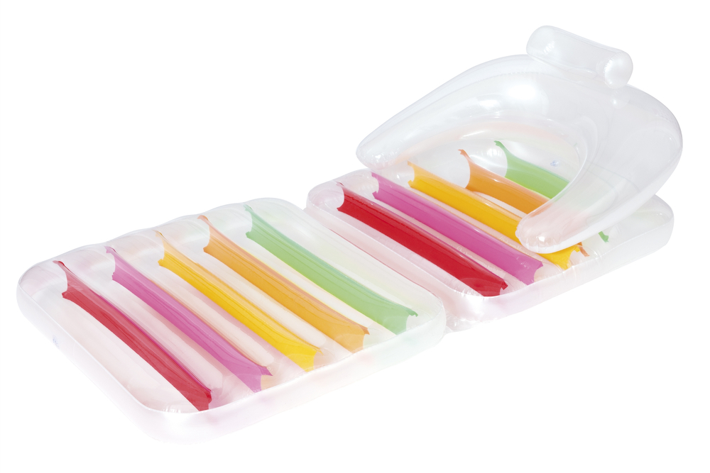 Bardzo wygodny i praktyczny materac przyda się wszystkim miłośnikom zarówno wody jak i spędzania czasu na plaży. Materac może służyć zarówno jako klasyczny materac do pływania, opalania jak i fotel do siedzenia . Dodatkowym atutem, który zapewni Ci wygodę i relaks są podłokietniki i dmuchane oparcie. Klasyczne białe elementy w połączeniu z tęczowymi elementami z pewnością przypadną Ci do gustu.