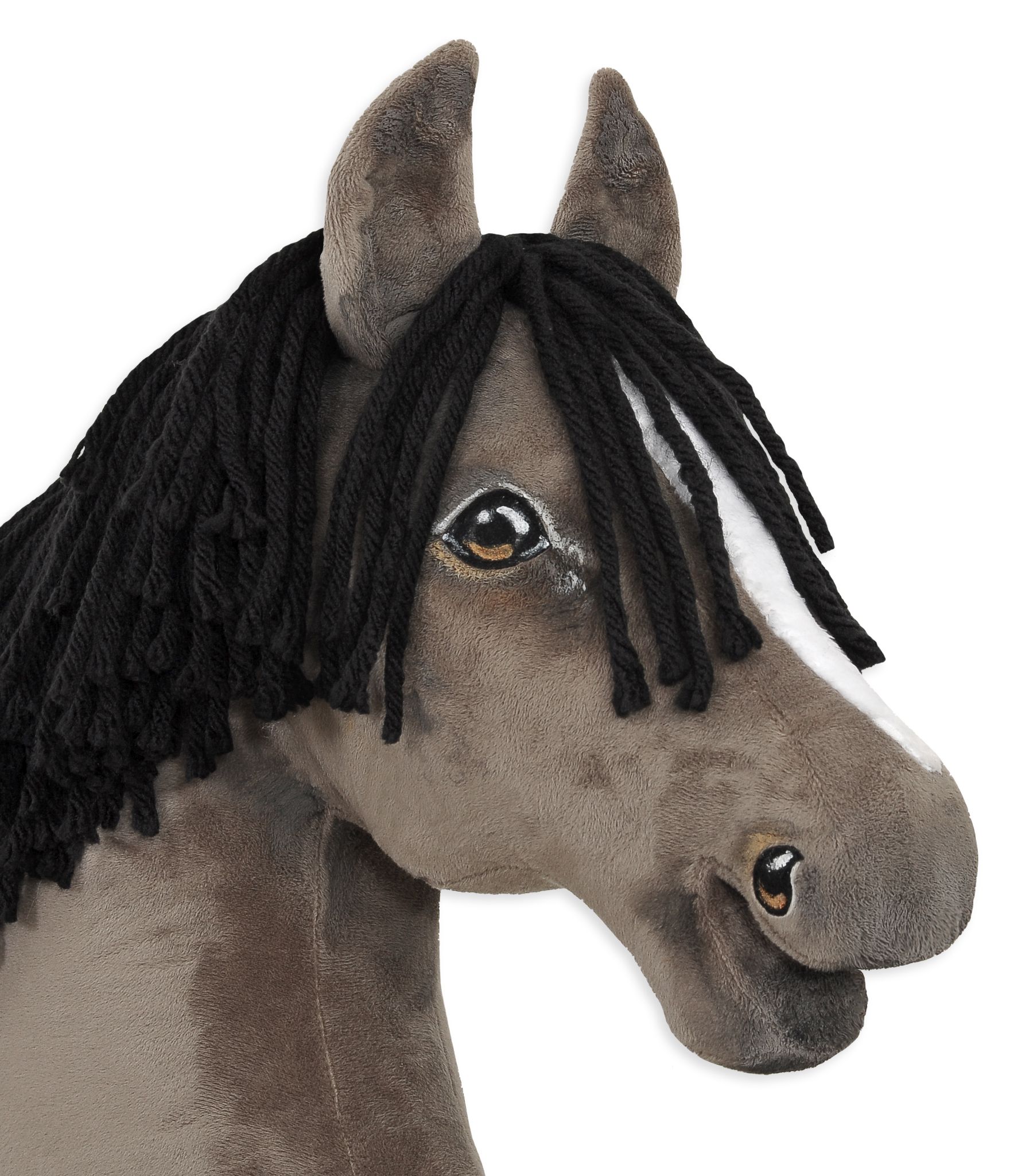 Brązowy duży Hobby Horse maści myszatej, z czarną długą miękką grzywą idealną do tworzenia pięknych fryzur. Na pysku biała strzałka.