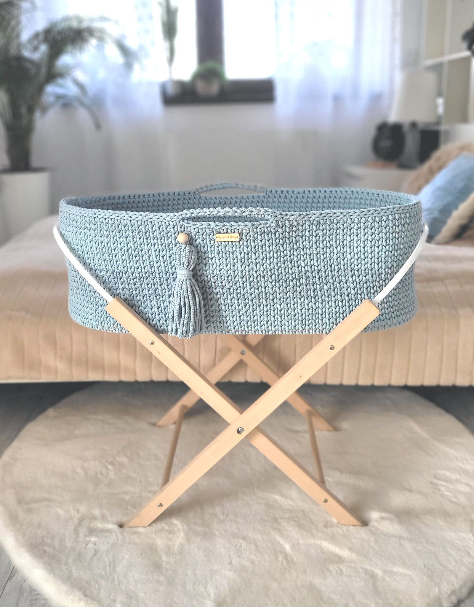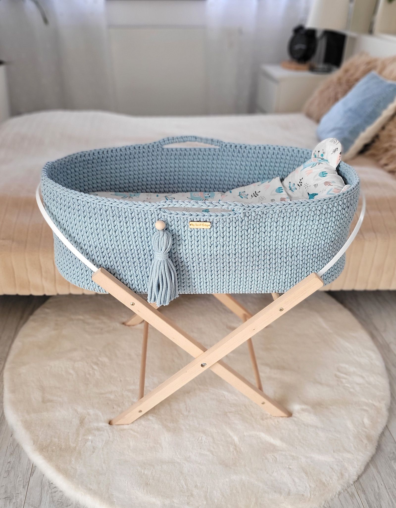 Kosz Mojżesza BOHO Handmade ze stojakiem misty blueKosz Mojżesza BOHO Handmade ze stojakiem misty blue