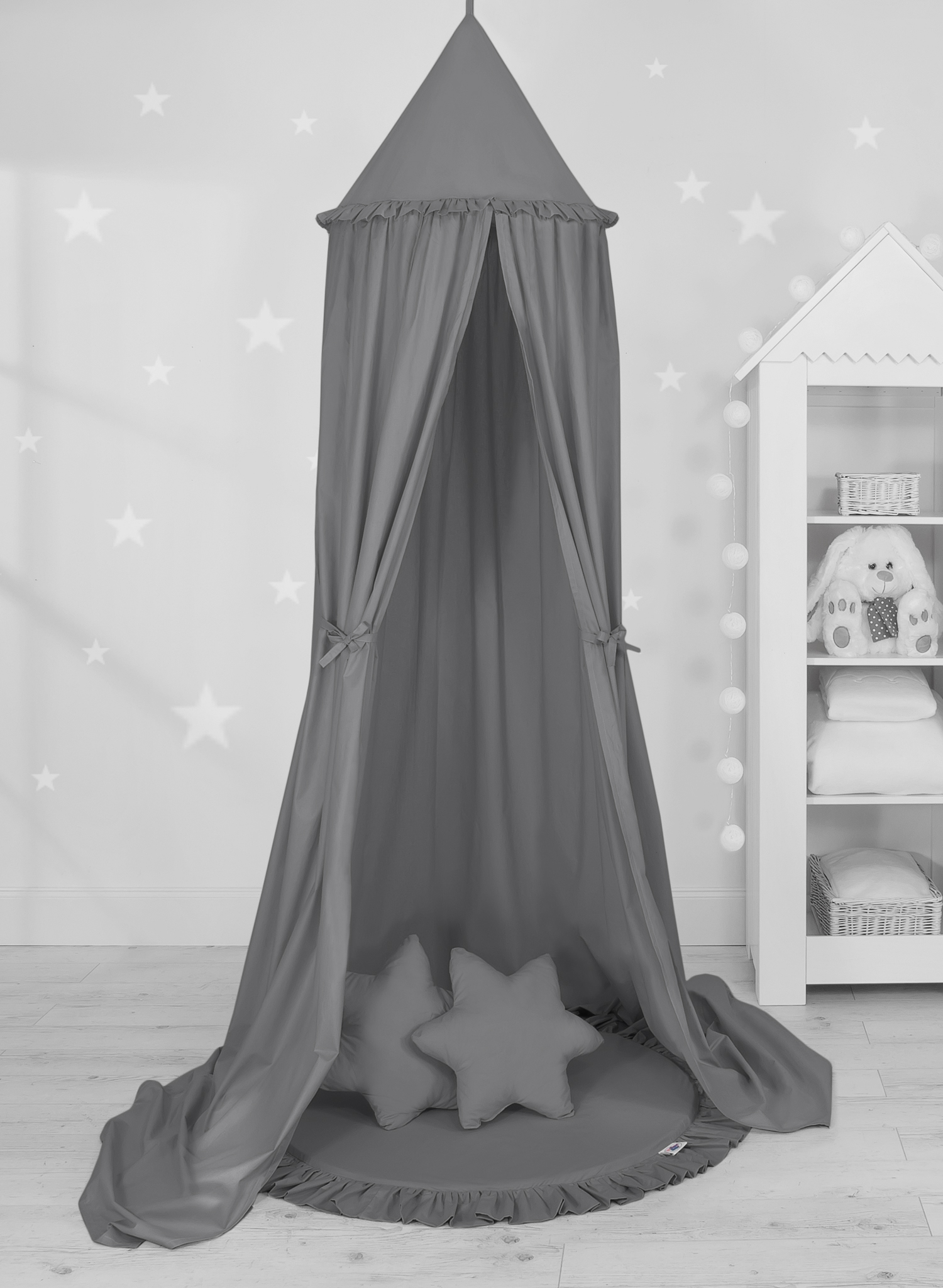 Okrągła mata z falbanką. Funkcjonalna i praktyczna. Doskonale sprawdzi się jako dywanik, mata do zabawy lub “podłoga” baldachimu. Już od pierwszych dni życia może służyć jako mata do leżenia na brzuszku. Posiada miękkie wypełnienie, które świetnie izoluje od twardej i zimnej podłogi. Okrągła mata to również świetne miejsce do zabawy i odpoczynku. Wykonana z tkaniny 100% bawełnianej, posiadającej atest Okotex. Mata jest rozbieralna, dzięki czemu łatwo wyprać sam pokrowiec. Wkładka maty wykonana jest z nowoczesnego antyalergicznego atestowanego surowca.