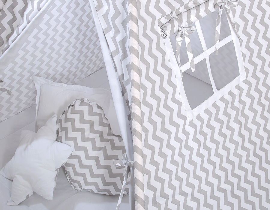 Namiot TIPI dla dzieci + mata + poduszki + zawieszki pióra - Chevron szaryNamiot TIPI dla dzieci + mata + poduszki + zawieszki pióra – Chevron szary