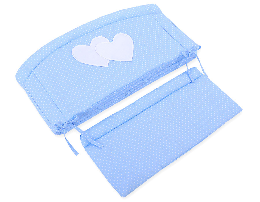 Zagłówek ochraniacza ozdobiony jest dużymi, starannie wykonanymi aplikacjami serduszek, obszytymi elegancką atłasową lamówką, co nadaje mu wyjątkowego uroku. To nie tylko praktyczny element, ale również piękna dekoracja łóżeczka.