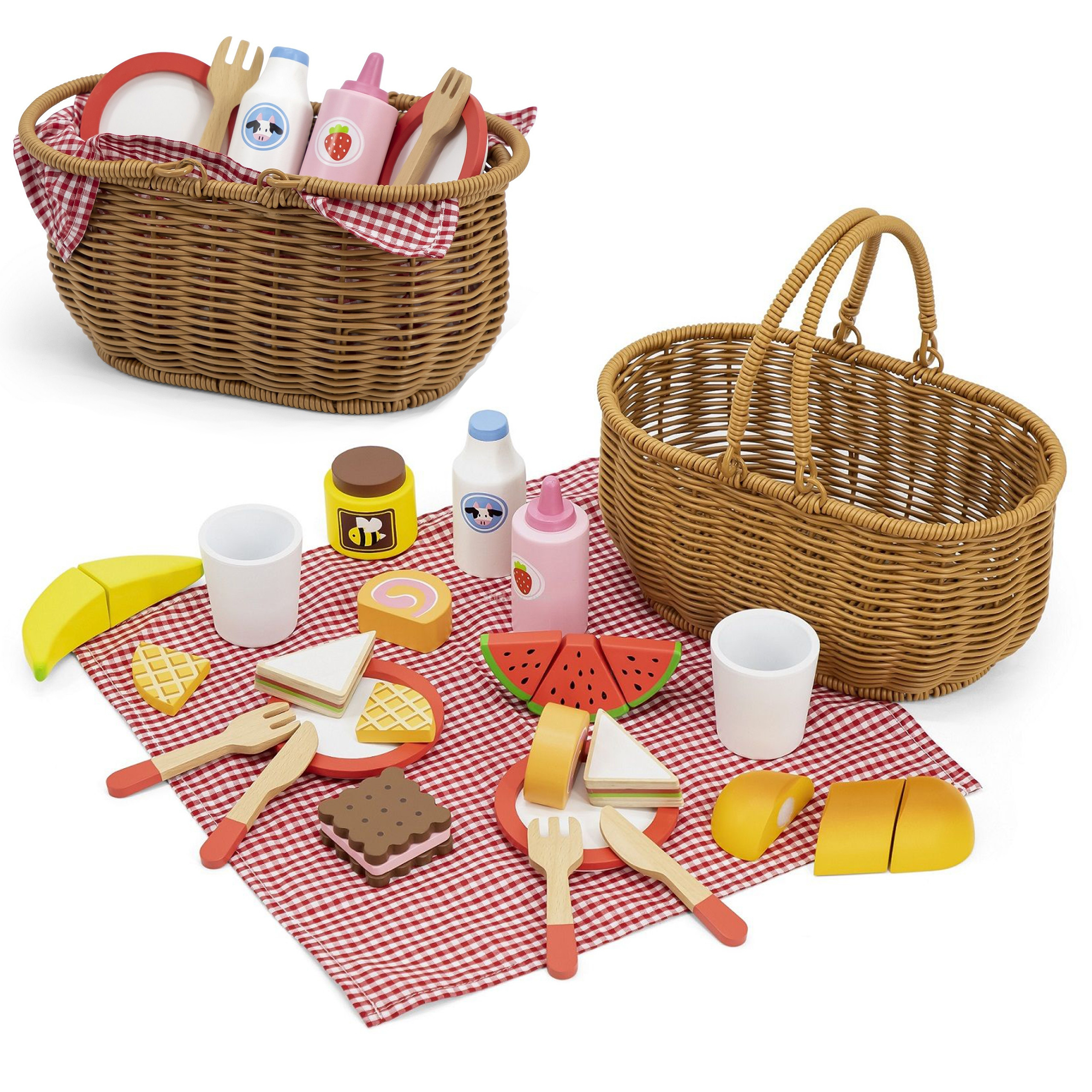 Wybierz się z przyjaciółmi na wesoły piknik z Drewnianym Zestawem Piknikowym od marki VIGA. Piękny koszyk wykonany ze sztucznej trzciny wypełniony jest drewnianym zestawem akcesoriów i tkaniną w kratę. Dzięki solidnym uchwytom Twoje dziecko z łatwością zabierze ze sobą cały zestaw, gdziekolwiek się uda. Zawarte w komplecie drewniane przekąski i akcesoria pozwolą na zabranie na piknik swoje ulubione zabawki, maskotki czy też odegranie scenki ze swoim przyjacielem. Zabawa z tym zestawem jest możliwa na świeżym powietrzu, jak i w domowym zaciszu. Część potraw składa się z kilku części i przymocowane są za pomocą rzepów. Za pomocą drewniane noża maluch może kroić je na kawałki, dzięki czemu rozwinie swoje zdolności motoryczne. Naśladowanie dorosłych przyczyni się za to do rozwoju umiejętności społecznych.