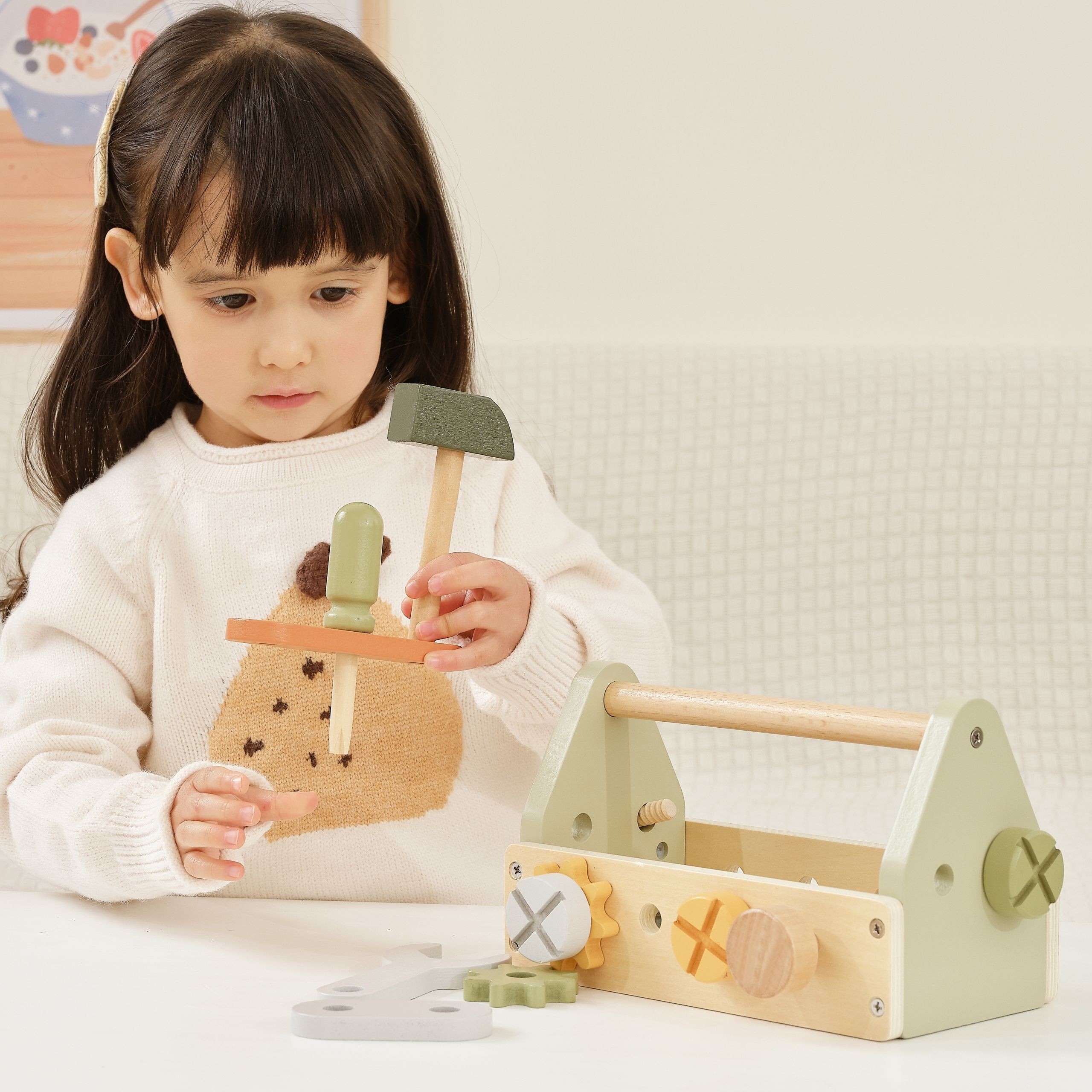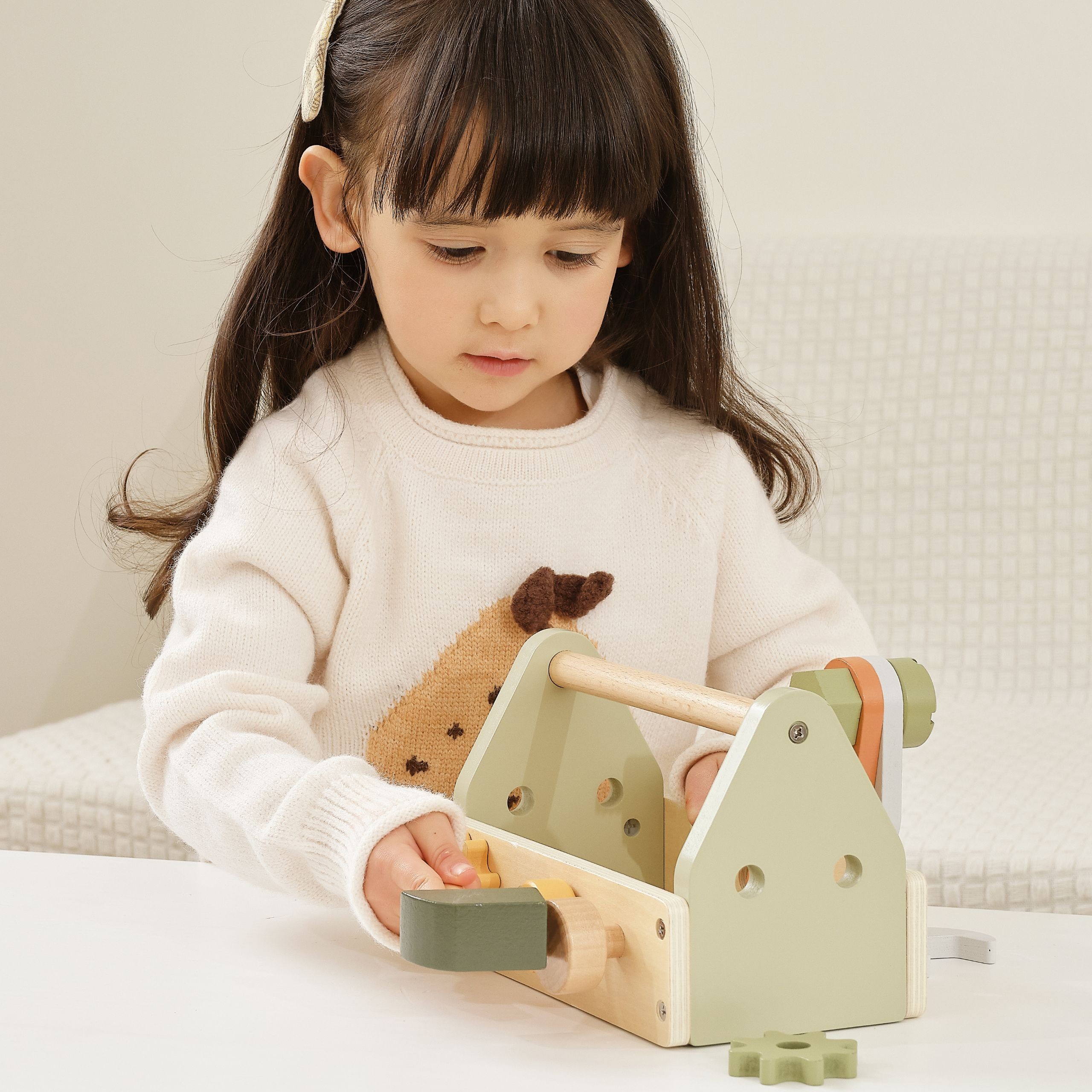 Drewniana skrzynka z narzędziami z serii PolarB od marki Viga to kompleksowy zestaw dla każdego małego majsterkowicza, który uwielbia naśladować dorosłych podczas domowych napraw. Zabawka składa się z wytrzymałego pudełka z ergonomicznym uchwytem oraz kompletu niezbędnych narzędzi wykonanych z naturalnego drewna bukowego. W bocznych ściankach skrzynki znajdują się specjalne otwory, które pełnią funkcję warsztatu – dziecko może w nie wkręcać śruby oraz przykręcać dodatkowe płytki za pomocą dołączonego klucza i śrubokręta. Zabawka działa na zasadzie klasycznego zestawu konstrukcyjnego, pozwalając maluchowi na wielokrotne montowanie i demontowanie elementów, co uczy cierpliwości oraz zrozumienia podstawowych zasad mechaniki.