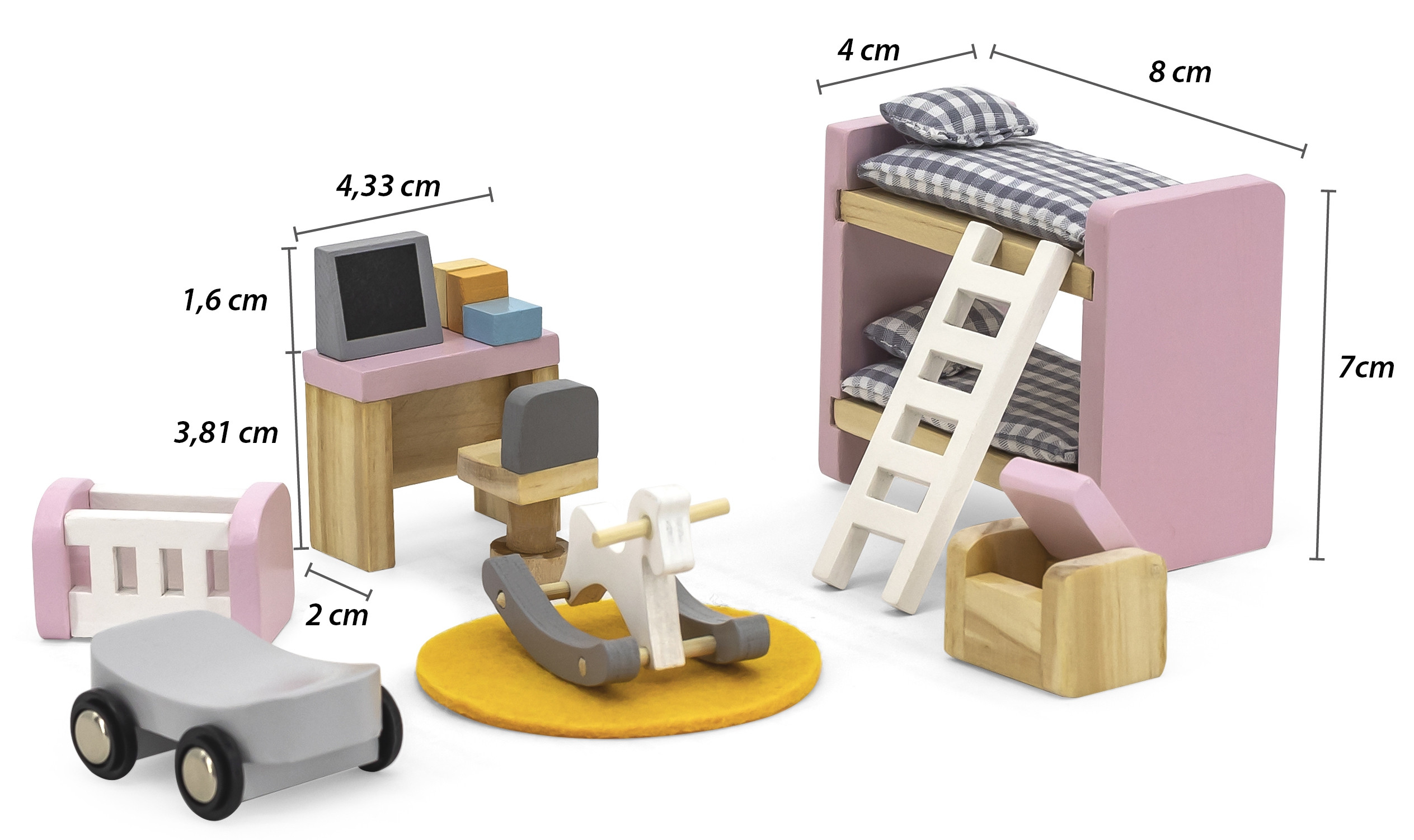 Seria zestawu mebelków dla lalek od renomowanej firmy Viga to idealny prezent dla twojego dziecka. Seria zawiera 5 różnych pomieszczeń w innych kolorystykach. Stwórz swój własny domek dla lalek i układaj meble oraz pomieszczenia wedle własnego uznania. Produkt wykonany jest z wysokiej jakości materiału oraz z dużą dbałością o szczegóły. Zabawka pomalowana jest nietoksycznymi farbami w łagodnej kolorystyce.