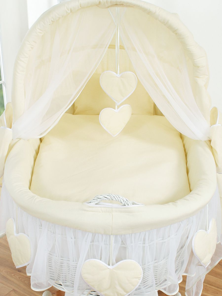 Wiklinowy kosz Mojżesza ze składaną budką Amelia – biały + kremowa pościel