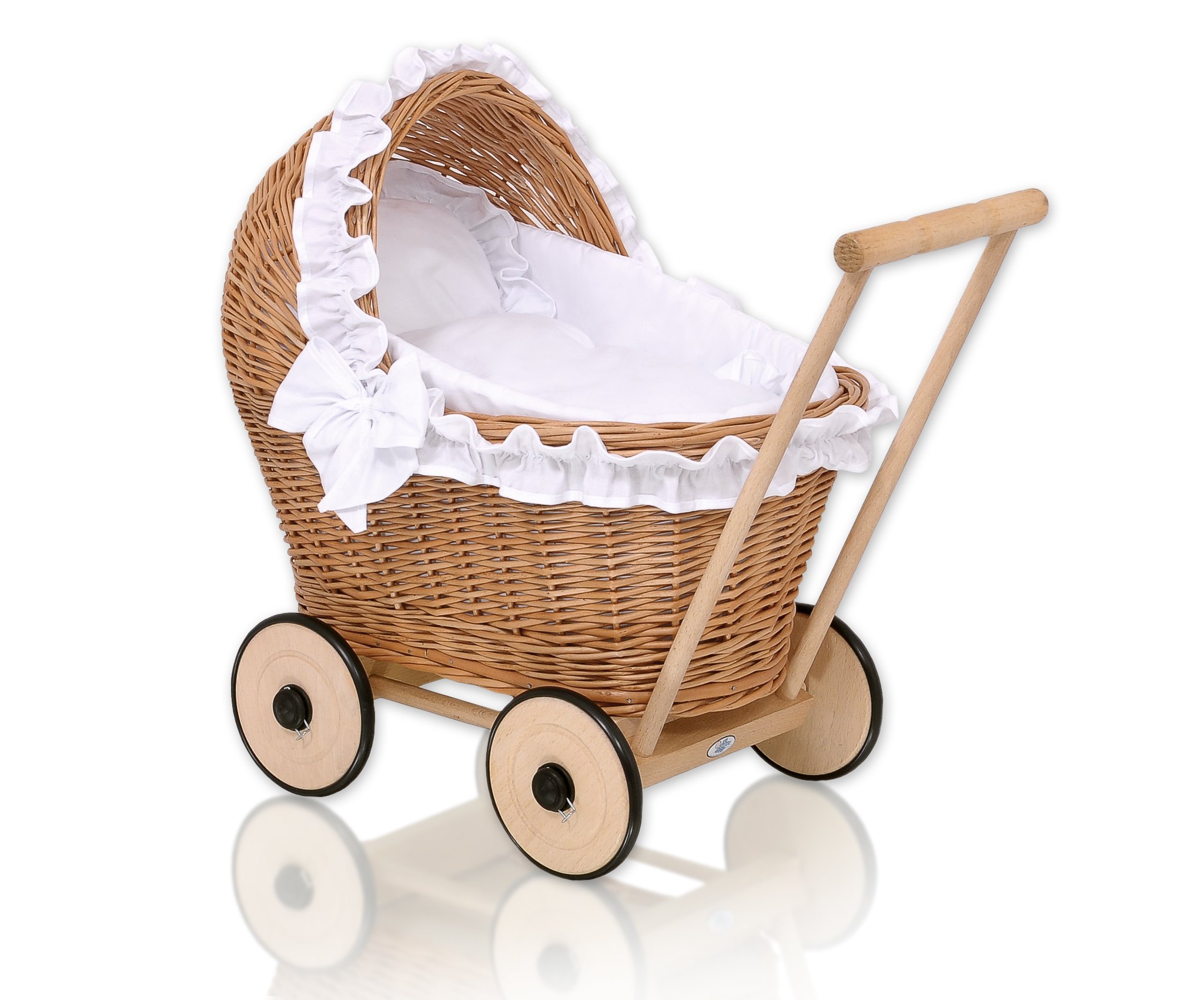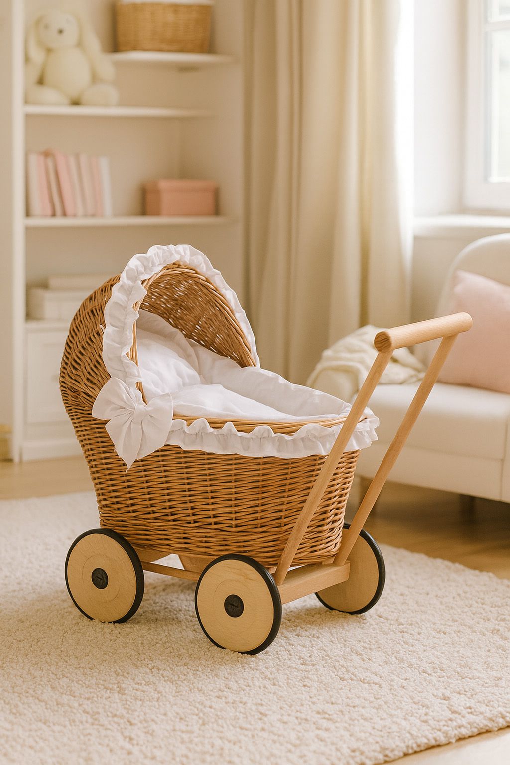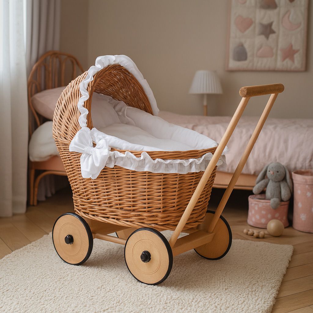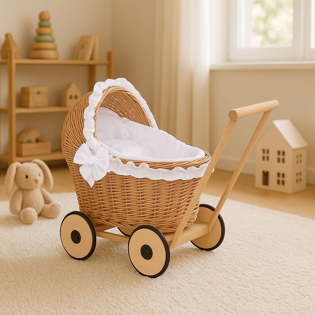 Wiklinowy wózek dla lalek z pościelką – ręcznie robiony pchacz z naturalnych materiałów
