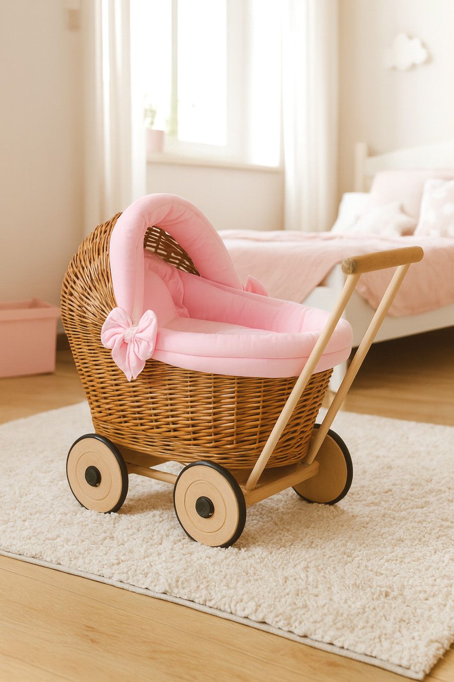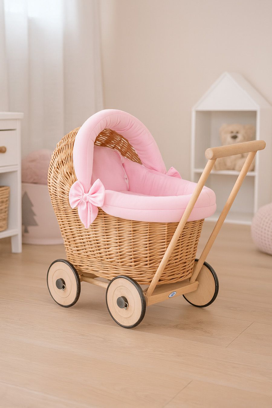 Wiklinowy wózek dla lalek pchacz z różową pościelką i miękką wyściółką STELLA – naturalny