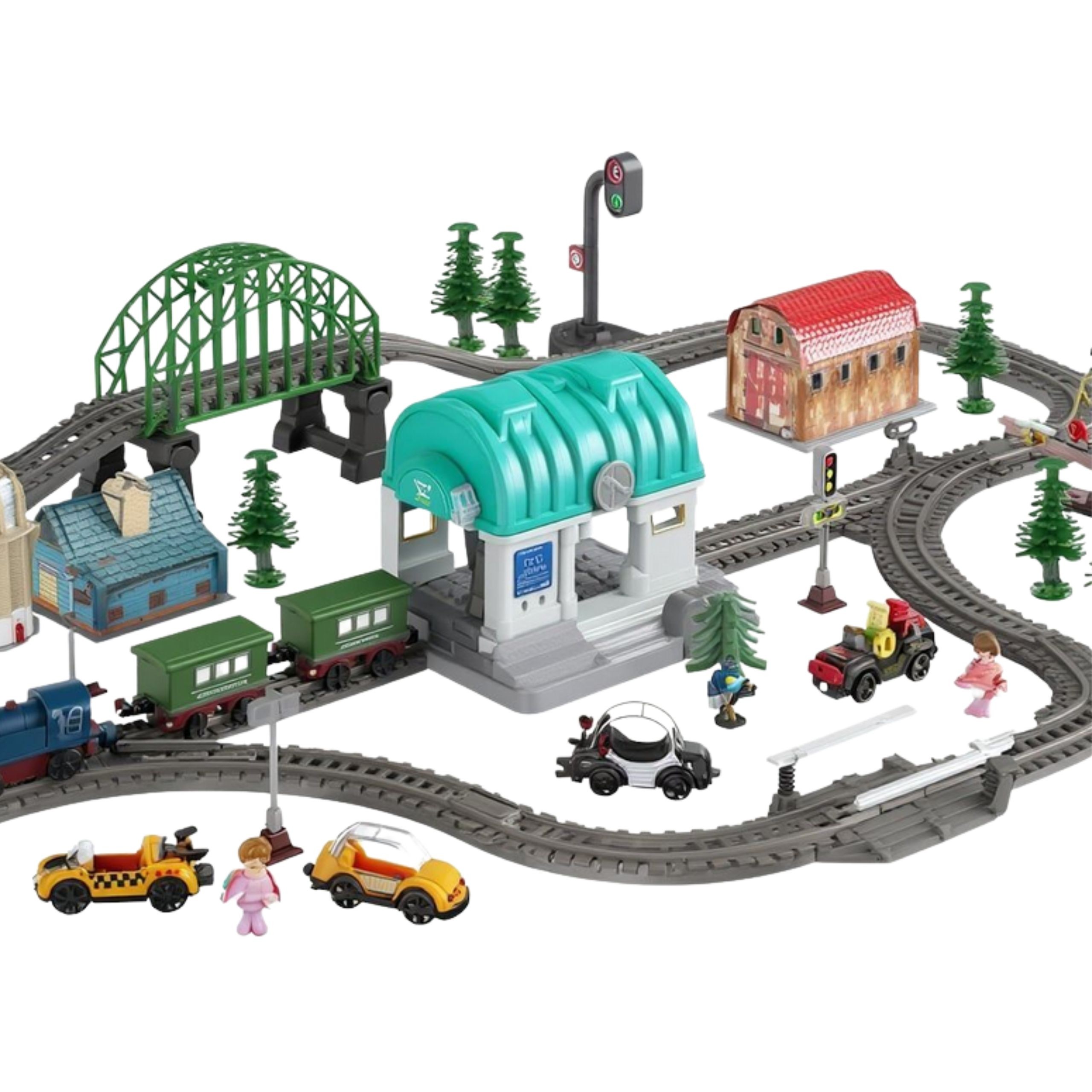 - – 108 elementów w zestawie – w tym tory, most, tunel, stacja, pojazdy i figurki