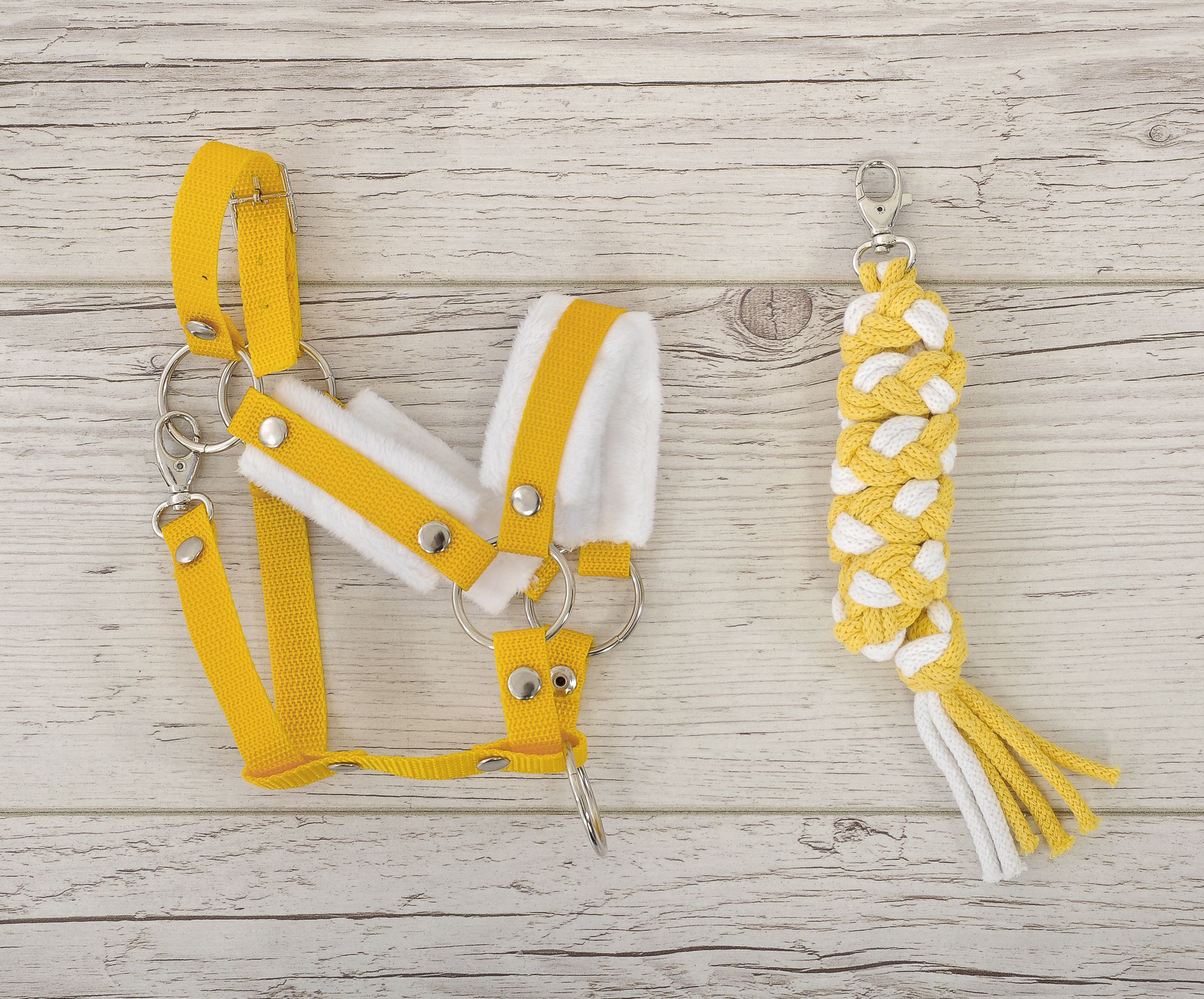 Zestaw do Hobby Horse: kantar A3 z białym futerkiem + uwiąz ze sznurka - biało-żółtyZestaw do Hobby Horse: kantar A3 z białym futerkiem + uwiąz ze sznurka – biało-żółty