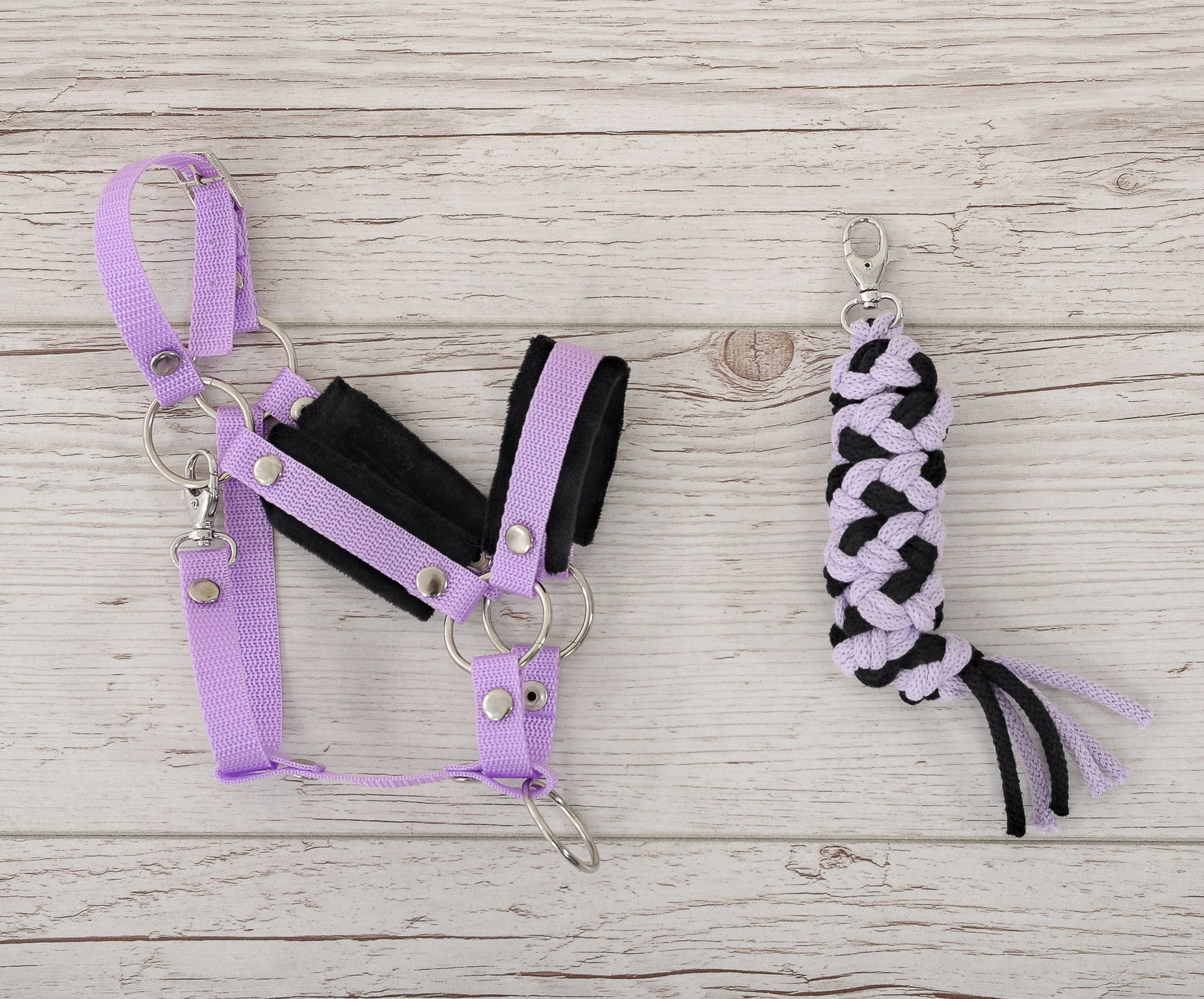Zestaw do Hobby Horse: kantar A3 z czarnym futerkiem + uwiąz ze sznurka – czarno-fioletowy